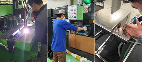비 규격 사이즈 파이프 롤링 최대 폭 1,000mm x 두께 3T → 비 규격 사이즈 파이프 자동 용접 → 비 규격 사이즈 파이프 진원도 작업 → 자격증을 보유한 전문 정밀 용접사들이 TIG / Laser 용접기를 이용하여 Leak 및 열변형을 최소화 하여 제품을 제작.